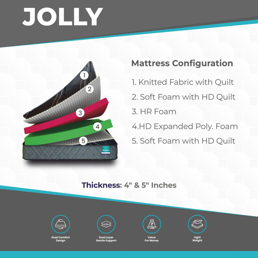 Experience luxurious sleep with JOLLY, featuring knitted fabric quilting, soft foam layers, HR foam, and HD expanded poly foam for superior support, durability, and ultimate relaxation. Designed for a restful, rejuvenating sleep!