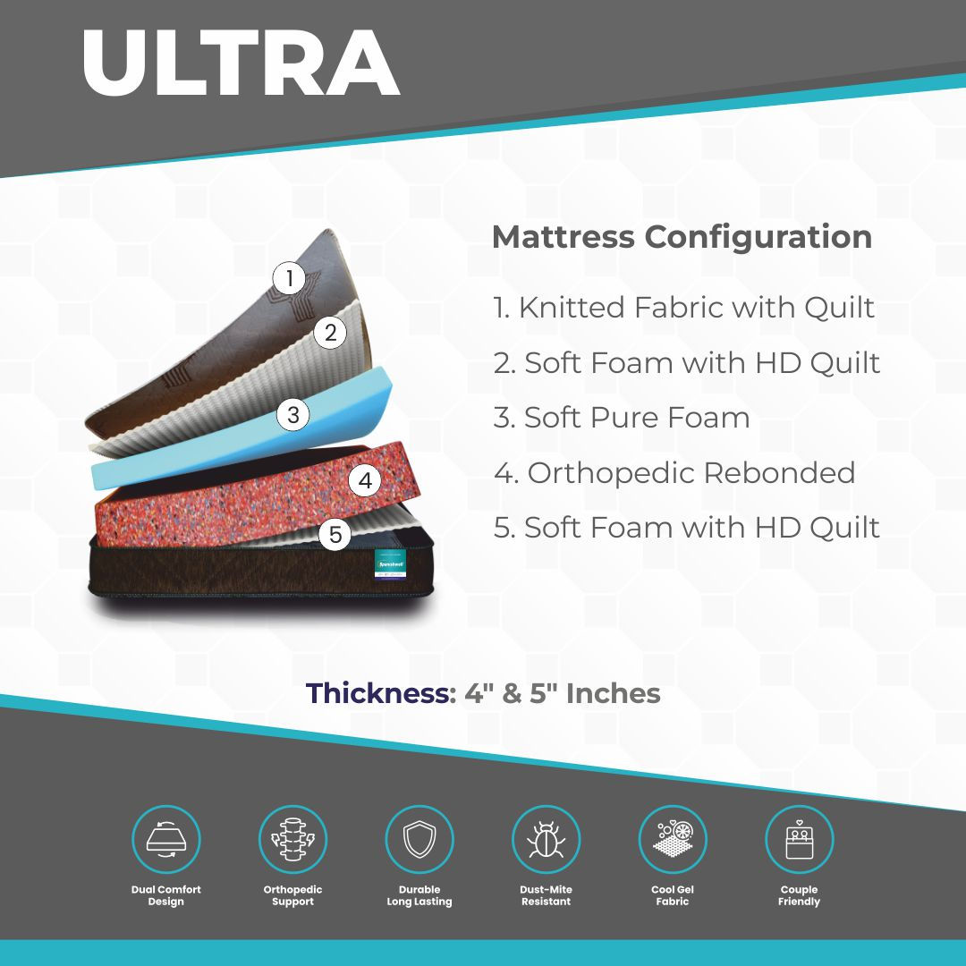 Designed for superior back support and pressure relief, ULTRA features knitted fabric quilting, orthopedic rebonded foam, soft pure foam, and HD quilted layers—ensuring optimal spinal alignment and deep, restorative sleep every night.